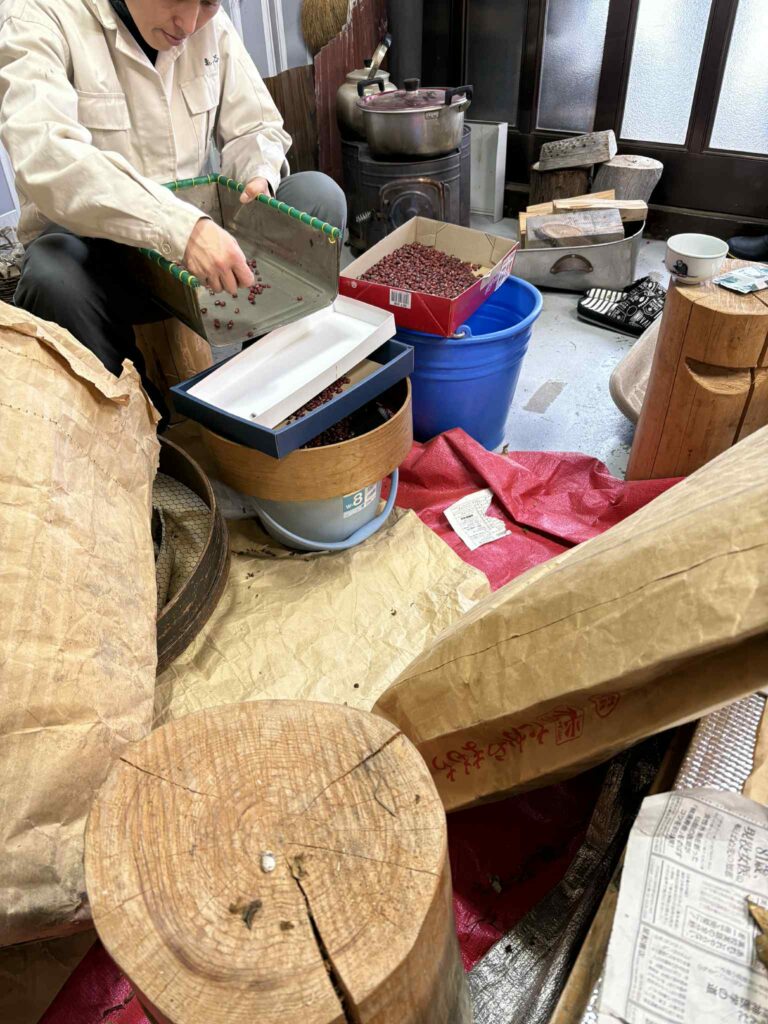 今回は秋に収穫した穀類(豆、あぶらえ、小麦)の脱穀選別のお手伝い。お餅やお味噌づくりに使うために、振るったり、つまんだり、転がしてゴミを取り除いてきれいにされています。