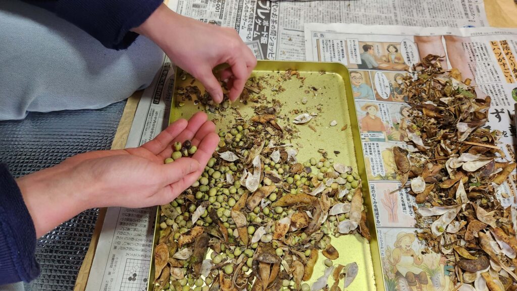 お喋りながら楽しくお手伝い!大豆の手脱穀・選別のお手伝いを行いました